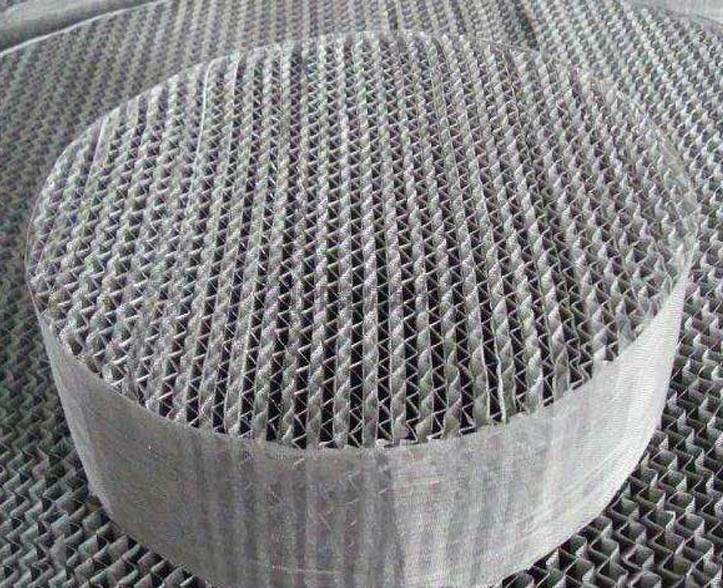 金属丝网波纹填料是网波纹填料的主要形式,它是由金属丝网制成的。金属丝网波纹填料的压降低,分离效率很高,特别适用于精密精馏及真空精馏装置,为难分离物系、热敏性物系的精馏提供了有效的手段。尽管其造价高,但因其性能优良仍得到了广泛的应用。